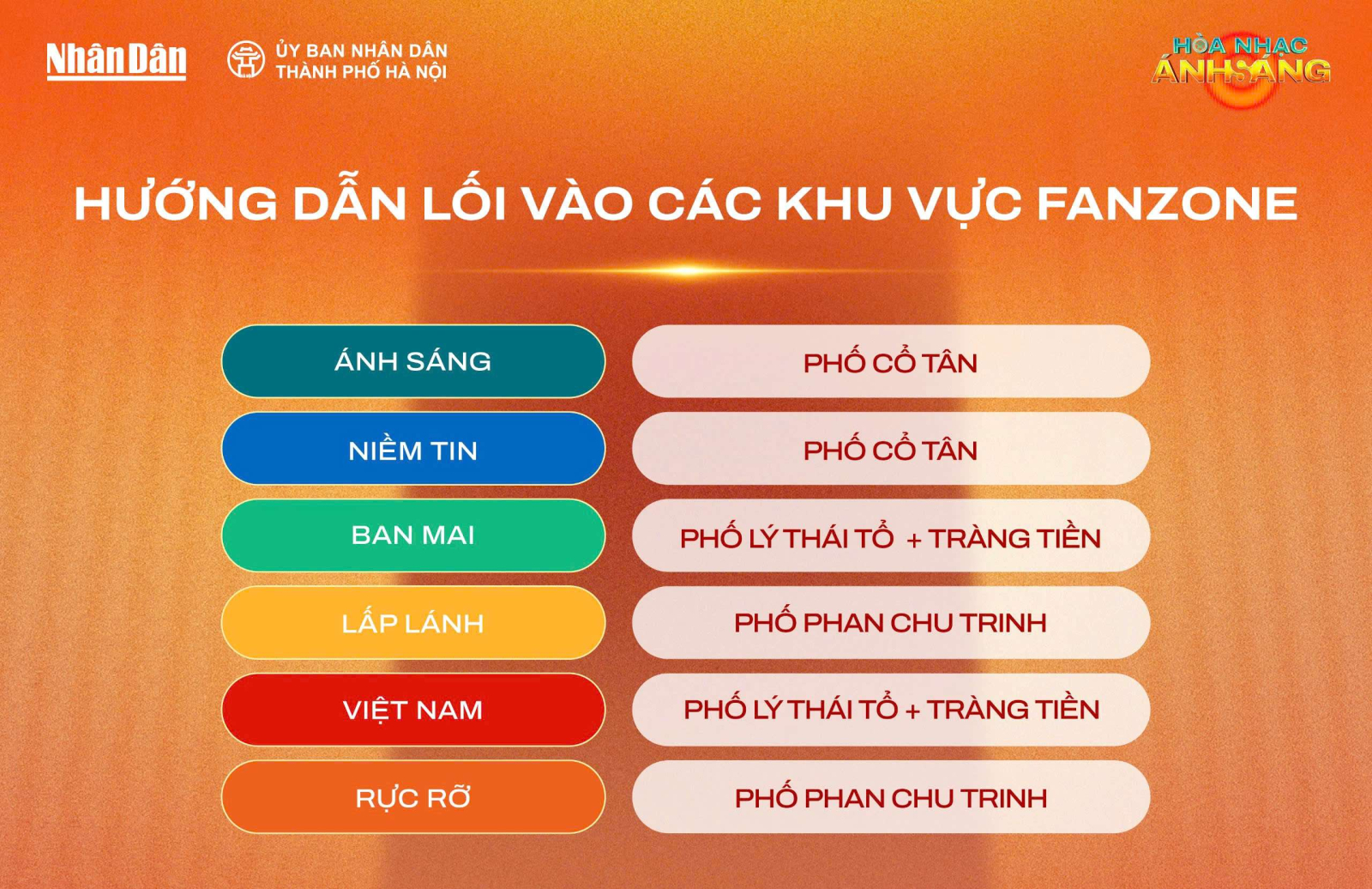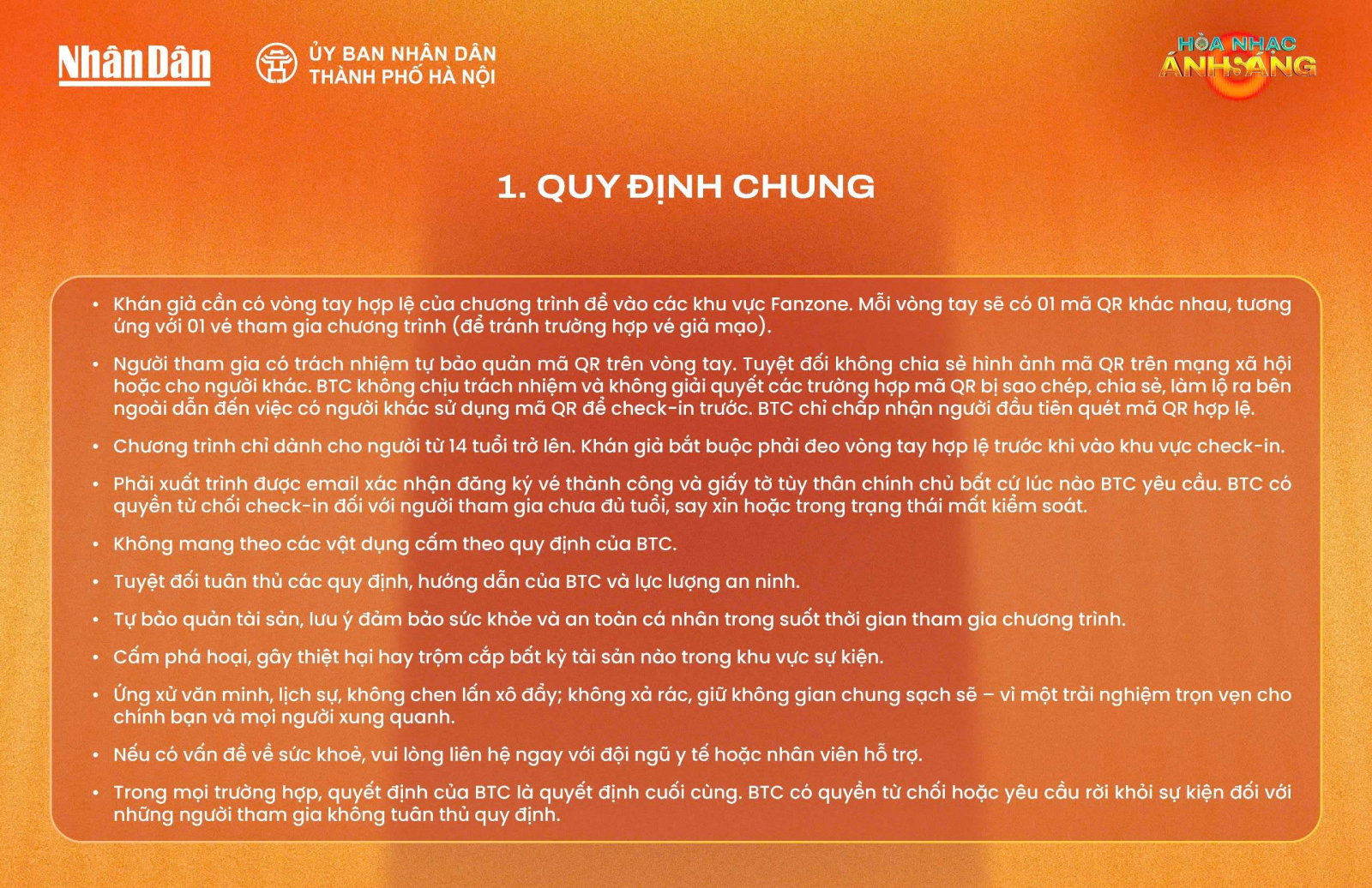 - Vé Fanzone tham dự “Hòa Nhạc Ánh Sáng 2026” được tặng thông qua hình thức đăng ký trực tuyến trên cổng đăng ký của Ban Tổ chức (BTC). Khán giả đăng ký vé thành công sẽ nhận được email xác nhận của BTC, trong đó bao gồm mã QR để đổi vòng tay và thông tin điểm đổi vòng.