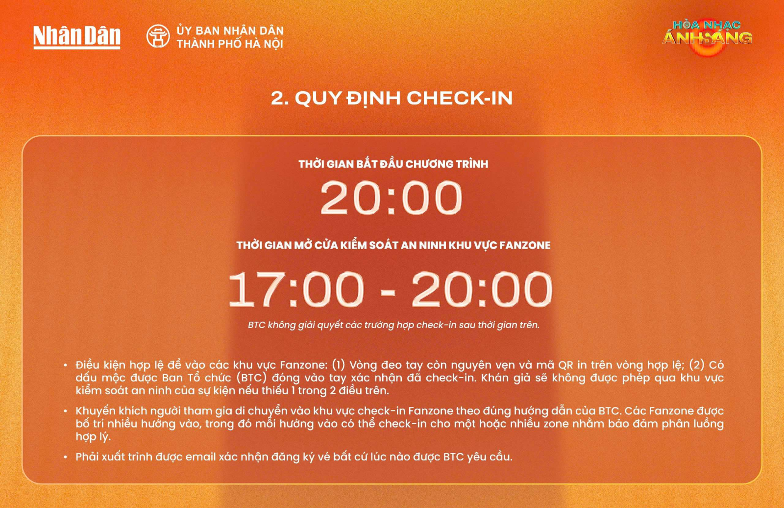 - Thời gian mở cửa kiểm soát an ninh khu vực Fanzone: 17h00 - 20h00. BTC không giải quyết các trường hợp check-in sau thời gian trên.